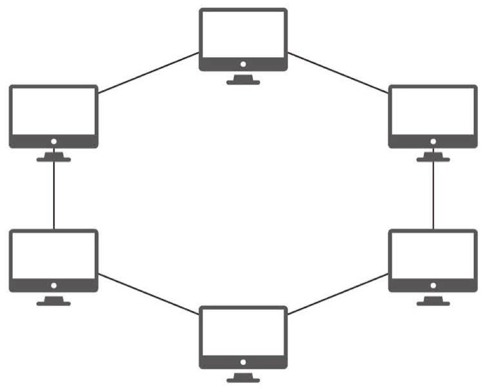 각각의 노드가 양 옆의 두 노드와 연결하여 전체적으로 고리처럼 하나의 연속된 길을 통해 통신을 하는 망 구성 방식이다.